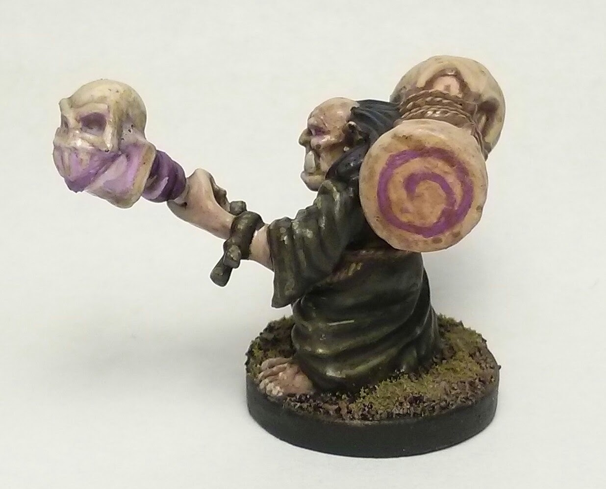Elder Mok is one of my favorite paint jobs. I think his drum turned out quite well, looking like warn canvas. For the ends, I freehanded the game's spirit icon. I was very nervous, but I think it turned out well, although if I could do it again, I would not have given it the same orientation on each side. The purples on the skull were fun to paint, and he has a soft OSL effect on the skull and his own eyes. I am happy with the skin tone and shading here too, all done by building up layers from a shade to highlights.
