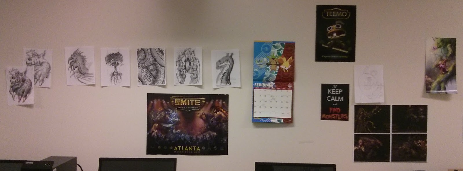 On the East wall, we have a great collection of posters and sketches. I encouraged students to bring in some wall decorations early in the semester, and one jumped right on that, bringing the Teemo and Smite posters, and later, the calendar. Once we got our theme, someone else brought in, "Keep Calm and Find Monsters." Today, we got the addition of some thematic Darkest Dungeon images and several original drawings for in-game monsters.